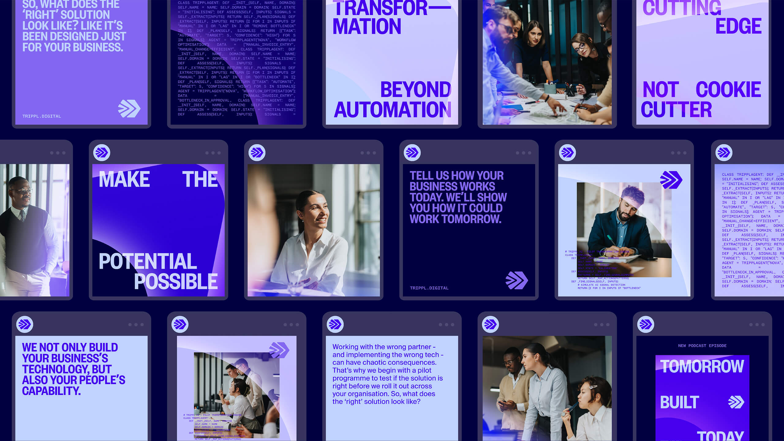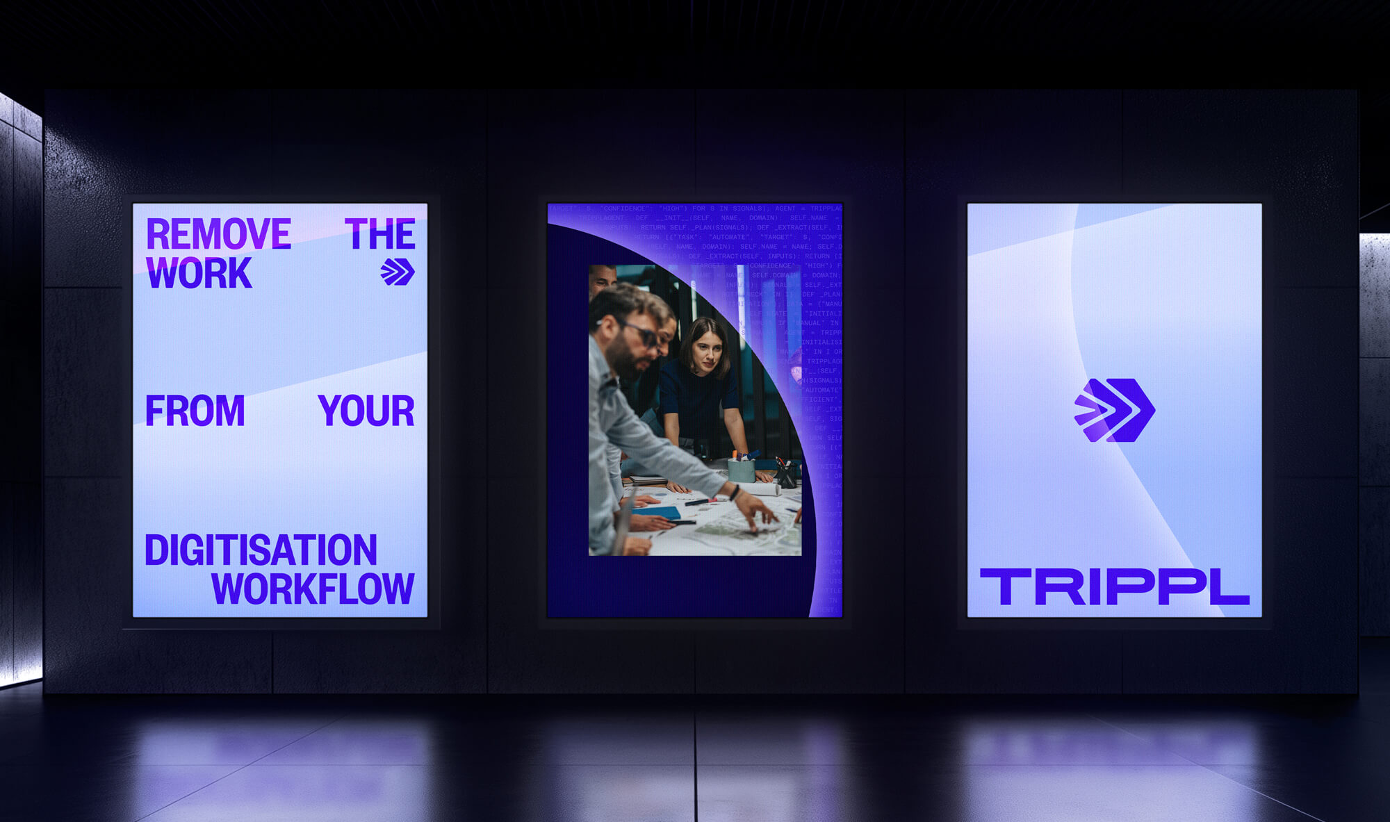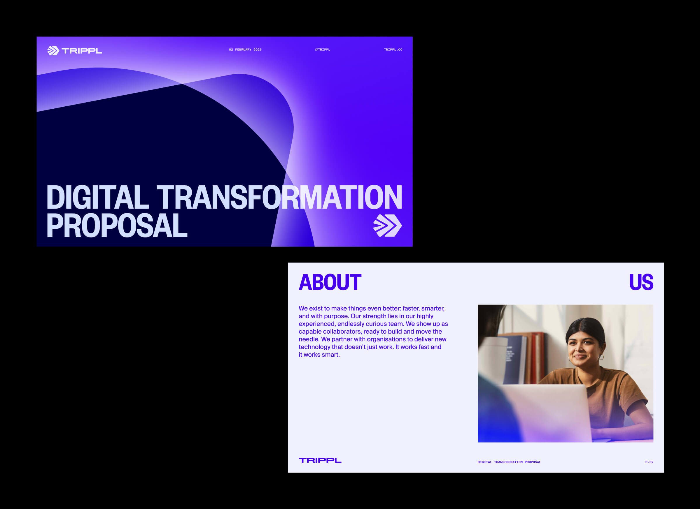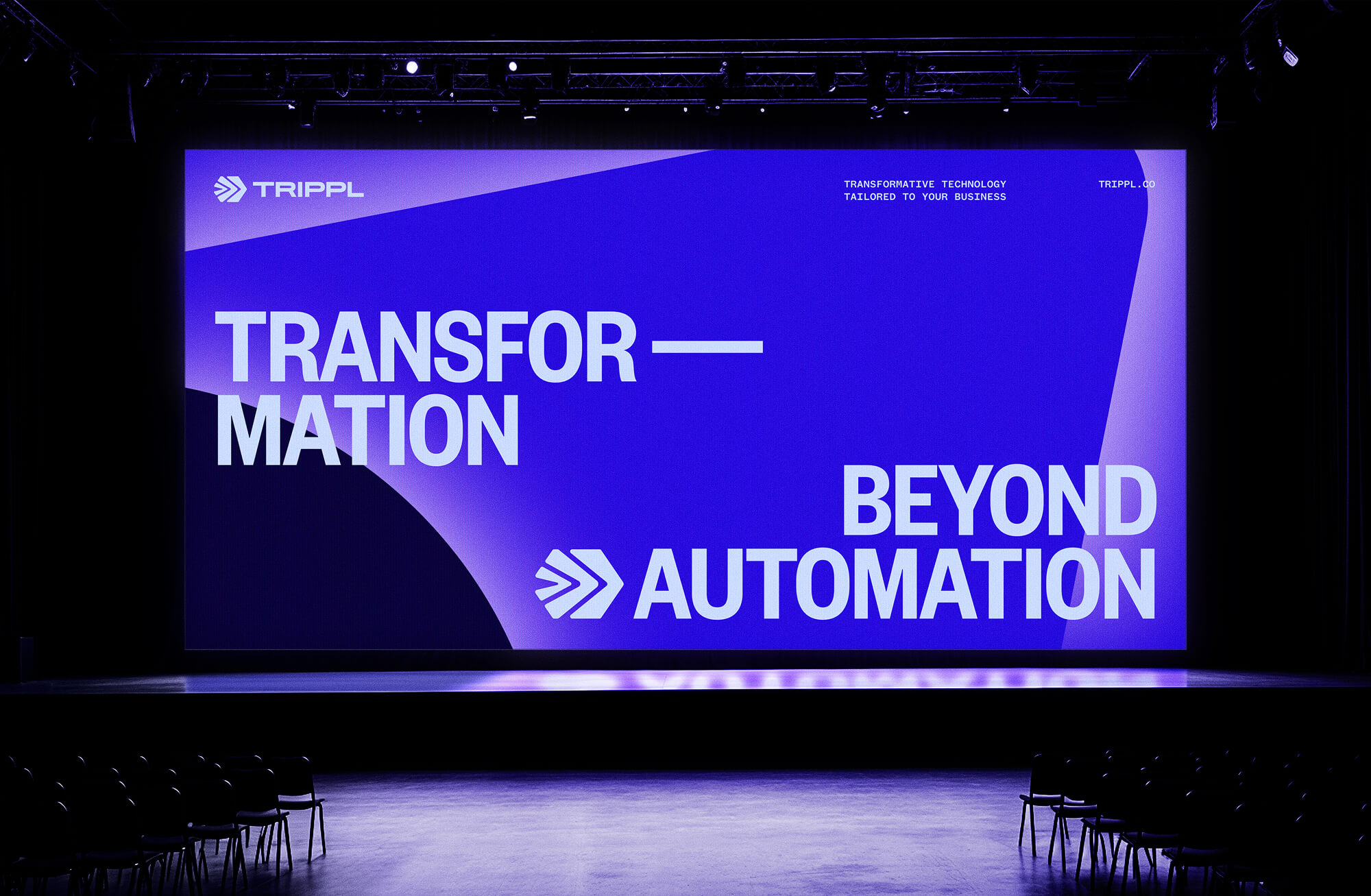 Trippl, the new name we developed, reflects the three core pillars behind any successful digital transformation: technology, internal capability and a client committed to change. These are expressed in the identity through three chevrons increasing in scale, moving from the current state through to the future state - representing the momentum and transformation Trippl creates for its clients.